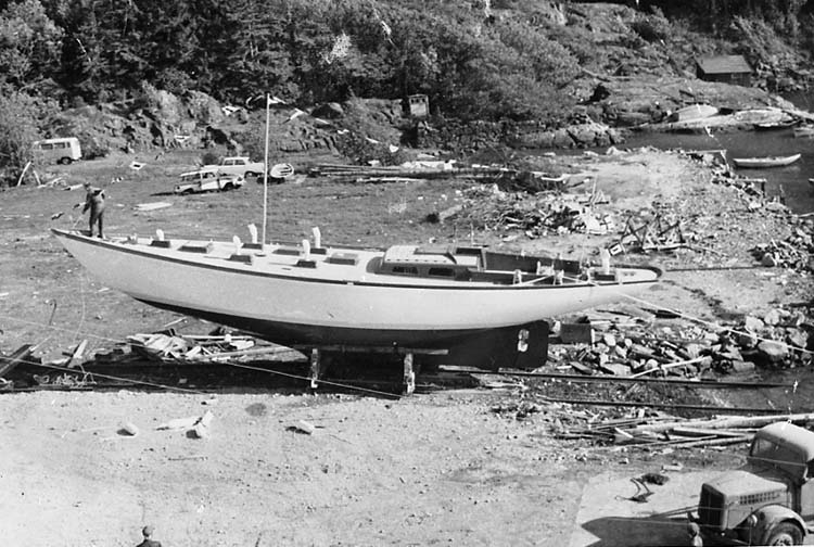 Medföljande text: "Sjösättning i juli 1968 av segelbåten "Best Luck" vid Bröderna Jacobsson Båtbyggeri Källviken, Dragsmark. Båten byggt vid varvet, köpare Hans Holm, Stockholm.