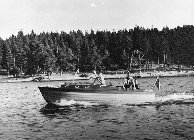 Medföljande text: "Ruffad motorbåt (1 6,5 m) med Albin 0-21 motor (19 hk), byggd 1950 av Wictor Carlsson, Örn (se även R 64:3 R 65:1 R 65:2). Motorbåten såldes till Ivar Svengard, Stockholm. Bilden tagen i Stockholms skärgård i början av 50-talet.