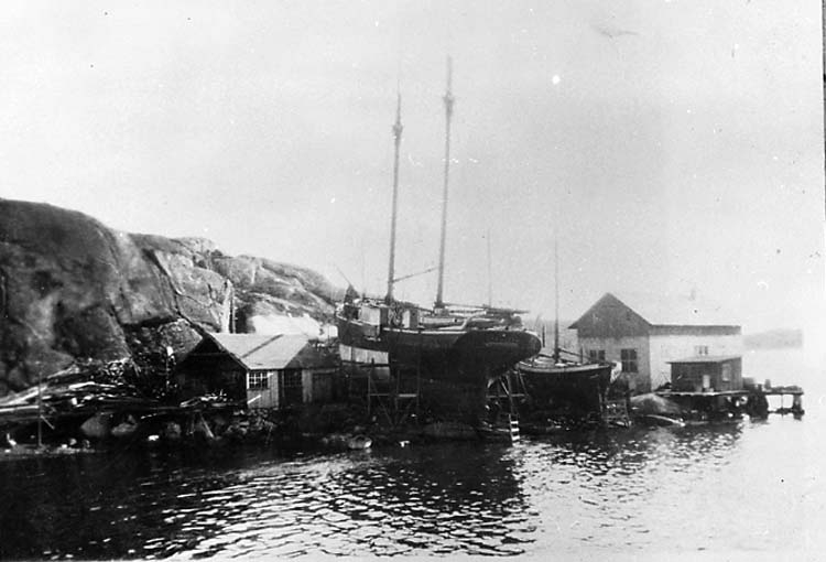Medföljande text: "Myrens Mekaniska Verkstad, Strömstad. Fraktfartyg på den vänstra slipen, Bilden tagen 1930-talet. Originalfoto tillhörande Allan Ljungqvist, Strömstad".