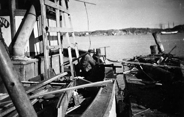 Medföljande text: "Varv, Carl och Gustav Olsson, Bovallstrand. Påsättning av räcka på större fiskebåt. På bilden syns Carl-Johan Johansson. Bilden tagen ca 1945.