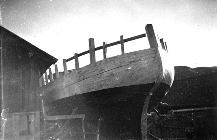 Medföljande text: "Carl och Gustav Olssons varv i Bovallstrand. Första fiskebåten (49 fot) som byggdes vid varvet (år 1952). se även R. 62:2, R. 62:4).