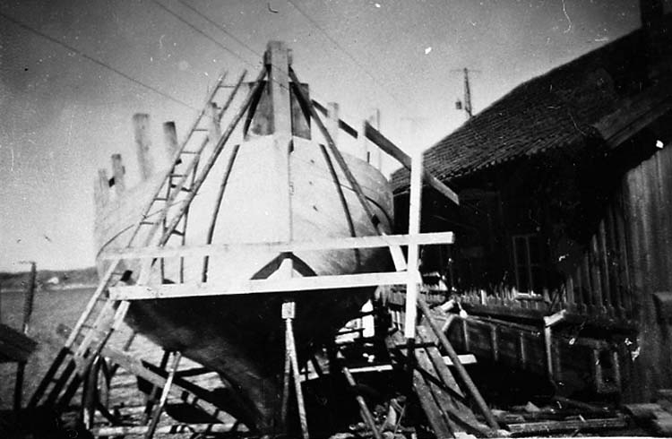 Medföljande text: "Carl och Gustav Olssons varv i Bovallstrand. På bilden syns den andra fiskebåten (49 fot) som byggdes vid varvet. (se även R 66:3). Till höger i bild syns varvets verkstadsbyggnad. Bilden tagen år 1953. Originalfoto tillhörande Gustav Olsson, Smögen".