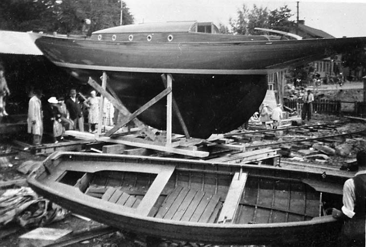Medföljande text: "Stenungsunds Båtvarv, Stenungsund. På bilden syns sjösättning av en nybyggd kustkryssare. (se även R. 63:4, R. 64:2). Bilden tagen 1946-1947.
