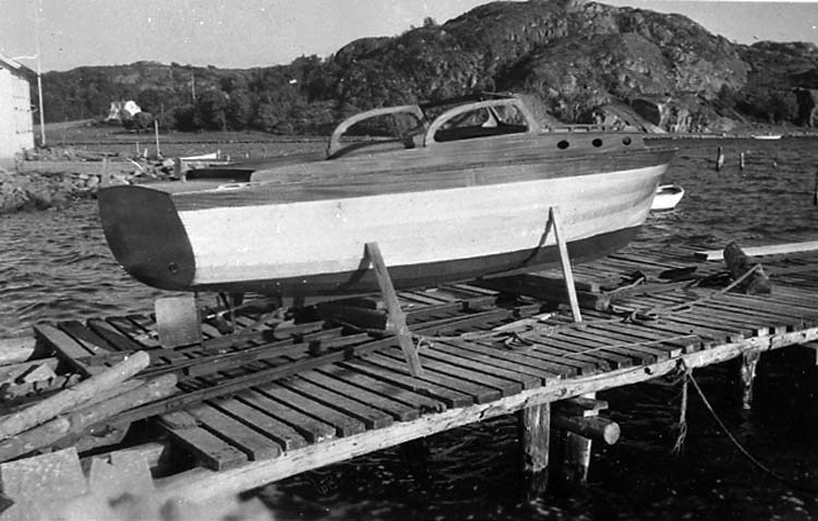 Medföljande text: "Ruffad motorbåt (6,5 m) med Albin 0-21 motor (10hk), byggd 1950 av Wictor Carlsson, Örn. Motorbåten såldes till Ivar Svengard, Stockholm. Bilden tagen vid sjösättningen. (se även R. 64:3, R.57:2, R.65:2). Originalfoto tillhörande Wiktor Carlsson, Örn, PA Kungshamn".