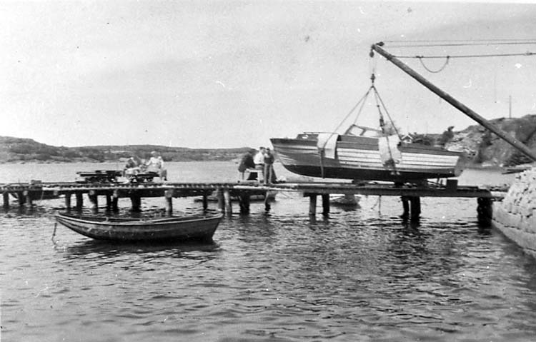 Medföljande text: "Ruffad motorbåt (16,5 m) med Albin 0-21 motor (10hk), byggd 1950 av Wictor Carlsson, Örn. Motorbåten såldes till Ivar Svengard, Stockholm. Bilden tagen vid sjösättningen. (se även R. 64:3, R.57:2, R.65:1)