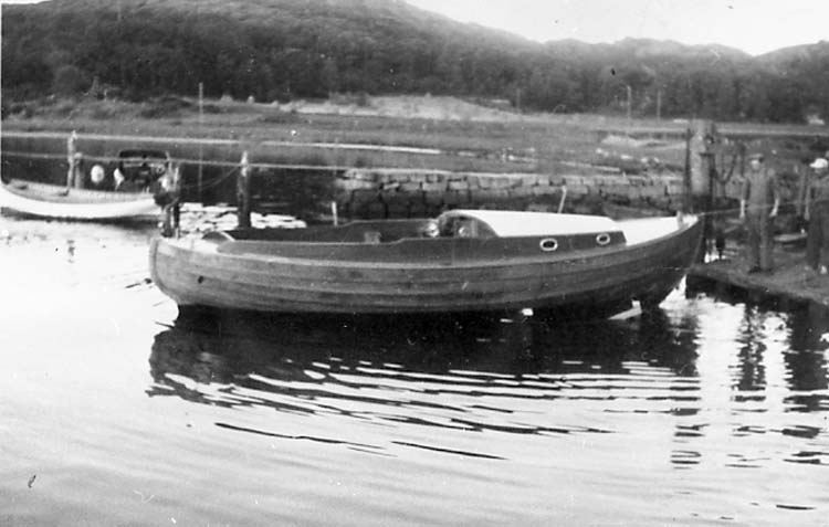 Medföljande text: "Leveransklar (frånsett pågarna) motorsnäcka, 24 fot. Byggd vid varv på Hamburgön (Erik Eriksson) år 1950. Bilden tagen nere vid gamla färjeläget. Originalfoto tillhörande Erik Eriksson, Hamburgö".