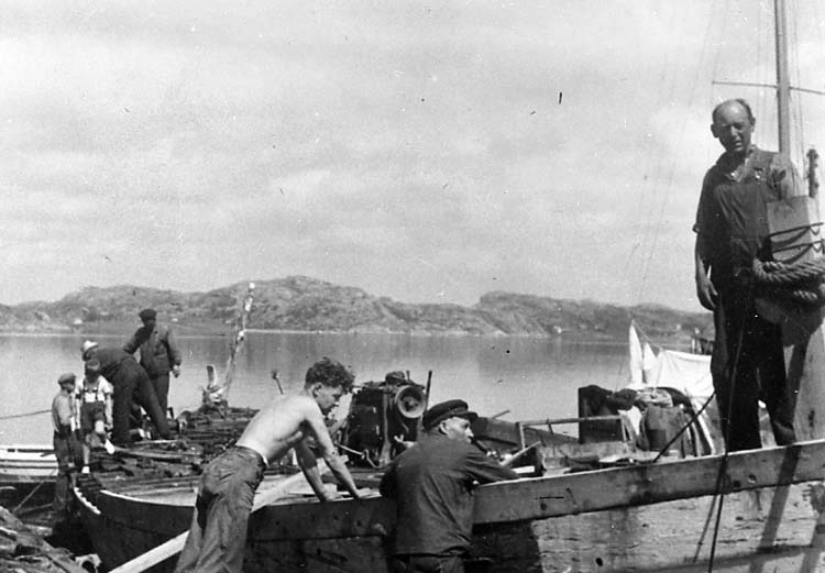 Medföljande text: "Carl och Gustav Olssons varv i Bovallstrand. Reparationsarbeten på fiskebåt. (se även R.67:3). Längst fram syns från höger Birger Tillander, Carl Olsson och Carl Johan Hansson: i bakgrunden från vänster Gustav Olsson, sommargästbarn (Sundkvist), okänd och Mauritz Mattsson. Bilden tagen under andra världskriget. Originalfoto tillhörande Gustav Olsson, Smögen".