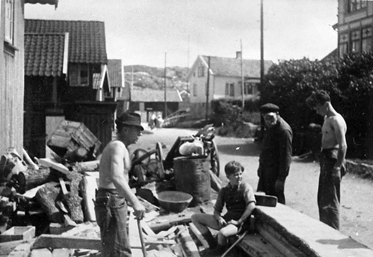Medföljande text: "Carl och Gustav Olssons varv i Bovallstrand. Byggnaden längst till vänster är varvets verkstad. Intill verkstaden syns krokväxt virke som ska användas till knän, mitt i bilden bordläggningsvirke (som pojken sitter på). Fr v en båtägare (okänd), sommargästsbarn (Sundkvist), Carl Olsson och Carl Johan Johansson. Bilden tagen under andra värlsdkriget. Originalfoto tillhörande Gustav Olsson, Smögen".