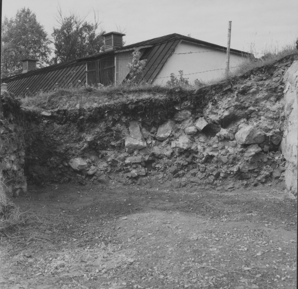 Gudsberga kloster, Husby socken. Rasmassorna i det norra skepet. Foto mot väster. Överst är ett matjordslager därefter följer stora gråstensblock samt underst ett lager av tegelsten.