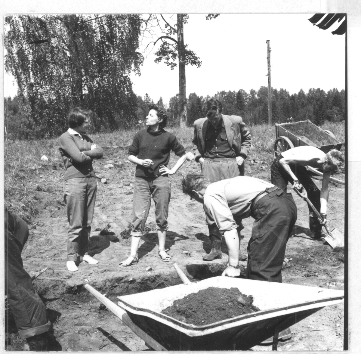 Gudsberga kloster, Husby socken. Undersökningen av Gudsberga klosterruin påbörjades den 10 juni. Bilden visar arbetet under de första grävningsdagarna. På bilden Kersti Jobs, Ingrid Swartling, P. H. Rosenström.