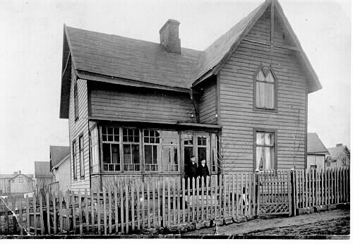 Villa i Egnahemsområdet på Östermalm, kv Lokföraren 5, Thulegatan 20. Husen uppfördes av järnvägstjänstemän med start 1905. På trappan syns Gunnar Dahllöf och John Dahllöf. Bilden är tagen mot väster.