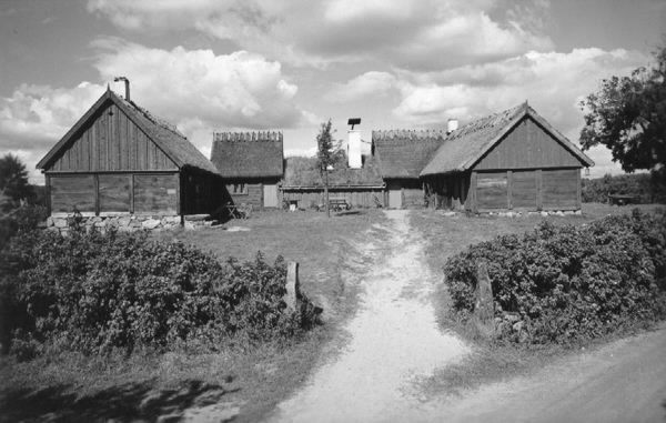 "Hembygdsgården Hallarna", Boberg. Exteriörbild. Högloftsstuga sammanbygd med två ekonomibyggnader i skiftesverk till en u-form. Högloftsstugan flyttades till platsen från Årstad när hembygdsgården bildades och invigdes 1943. Tidigare fanns en bostad i den högra längan. I trädgården står trädgårdmöbler.
