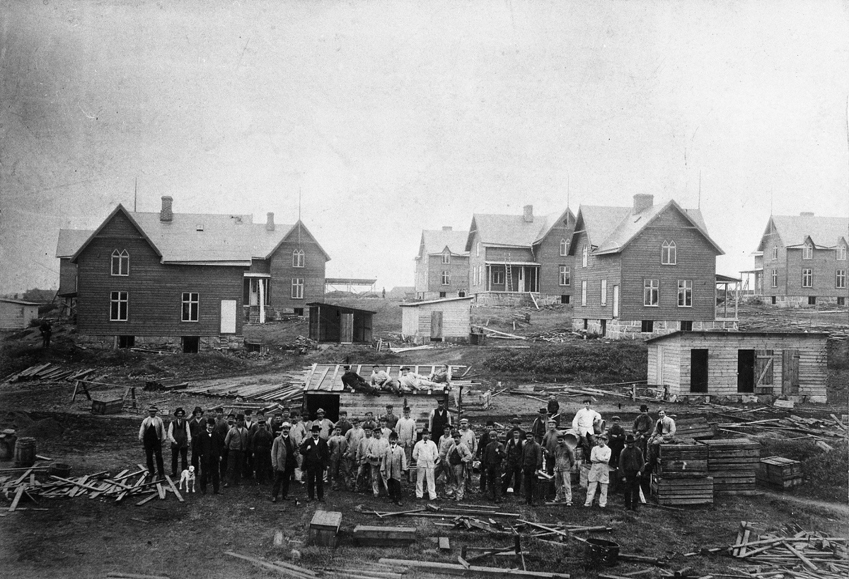 Husen i egnahemsföreningen på Östermalm under uppförande. Föreningen bildades av anställda vid Varberg-Borås järnväg. På bilden ses arbetare och arbetsledare, eventuellt blivande ägare framför en del av villorna. Från 1905-1906.