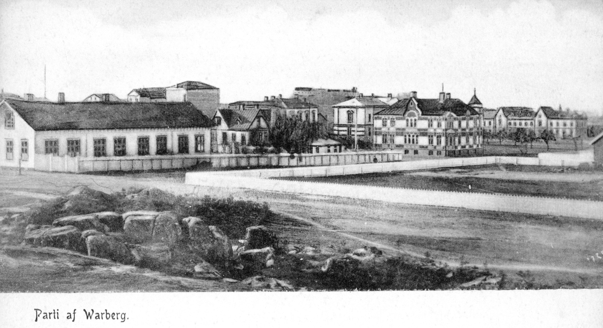 Brevkort, "Parti af Varberg". Vy från kv Lilla Kari med Östra Långgatan i förgrunden och Norra Folkskolan/Gamlebyskolan till vänster vid korsningen med Magasinsgatan. Längre ner ligger Bolanders hus i kv Prostlyckan och längst till höger ses järnvägsstationen vid Västra Vallgatan. Den staketomgärdade tomten utan synliga byggnader ligger i kv Gamleby. Byggnaden som skjuter upp bakom skolan är teatern, uppförd 1895.