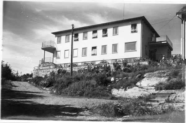 Exteriörbild. Semesterhem, Budskär. Putsat tvåvåningshus med två balkonger på gavlarna, beläget på en bergknalle. I slänten växer blommor och buskar.
