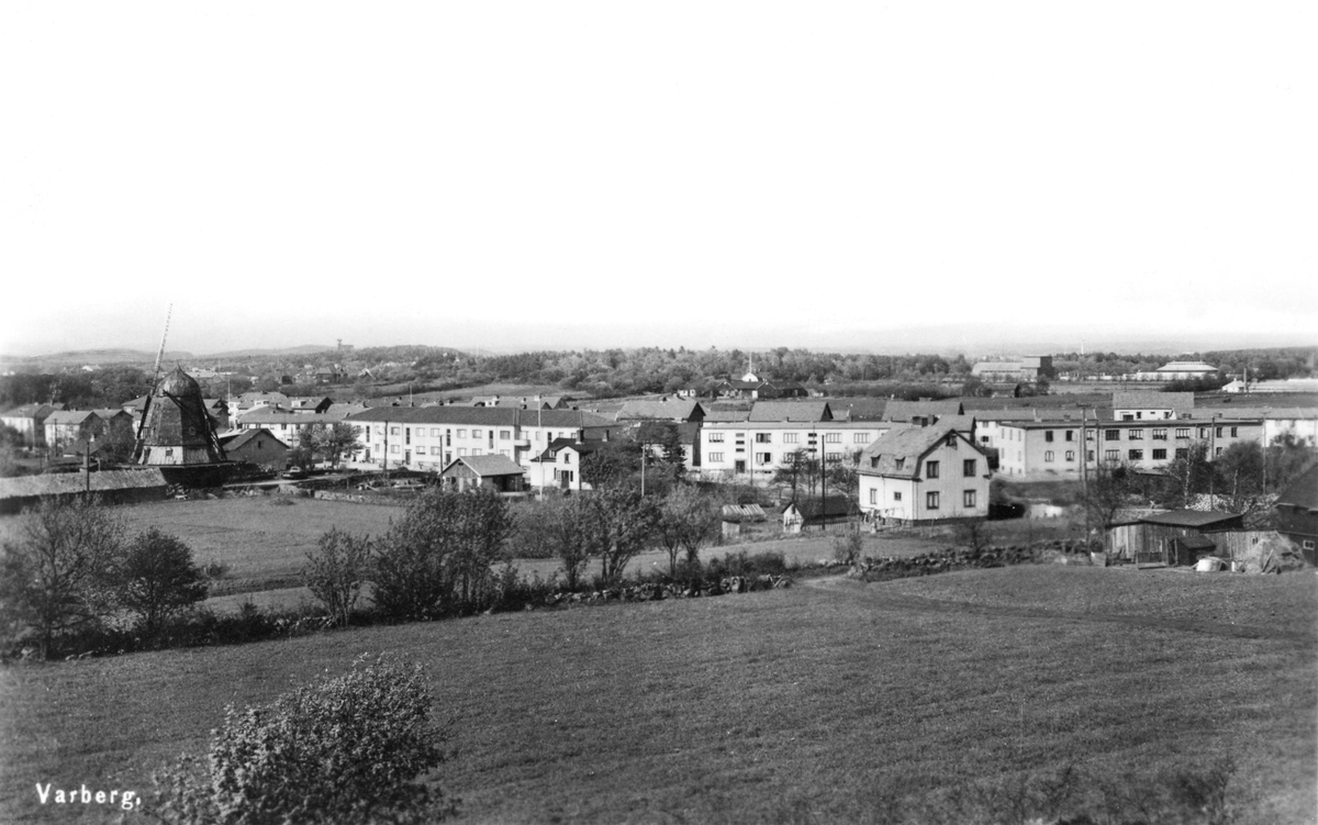 Vykort, "Varberg". Bostadshus vid Södra vägen i Varberg med kvarnen i kv Ryttaren till höger och flerbostadshus i kv Mörten. Kvarnen kallas Börjessonska kvarnen eller Lagerlundskvarnen. I förgrunden åkermark, numera kv Hästbönan, och i bakgrunden till höger ses dansbanan Rotundan i Nöjesparken från 1932.