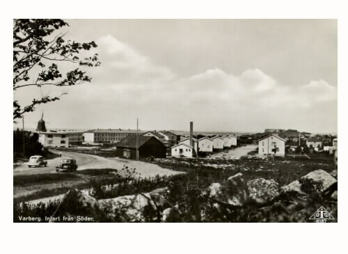 Vykort, "Varberg. Infart från Söder". Södra vägen svänger av åt vänster där flerbostadshusen i kv Mörten ligger. Lagerlundskvarnen, även kallad Börjessonska kvarnen, står i kv Ryttaren. Längs Almers väg (som numera når fram till Södra vägen) ligger kv Rudan på vänster sida och kv Stenbiten till höger.