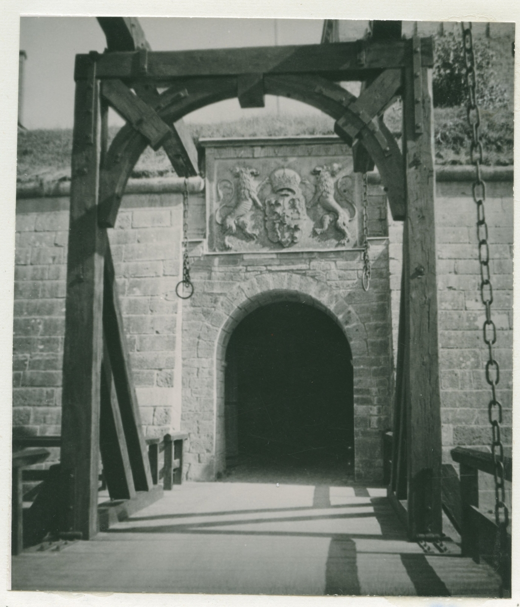 En slottsingång. Portal med vindbrygga och det stora riksvapnet.