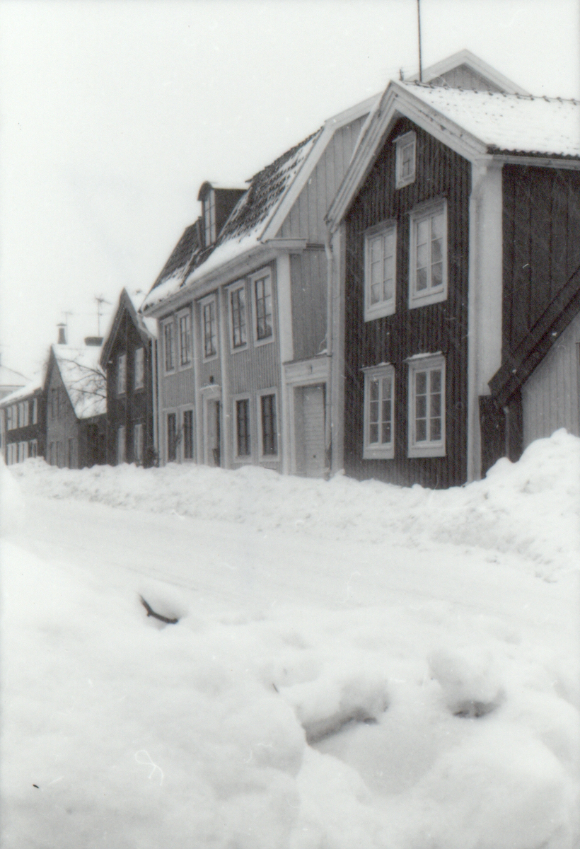 Bostadshus med träfasad i vintertid. Ett av husen har mansardtak och takkupa.