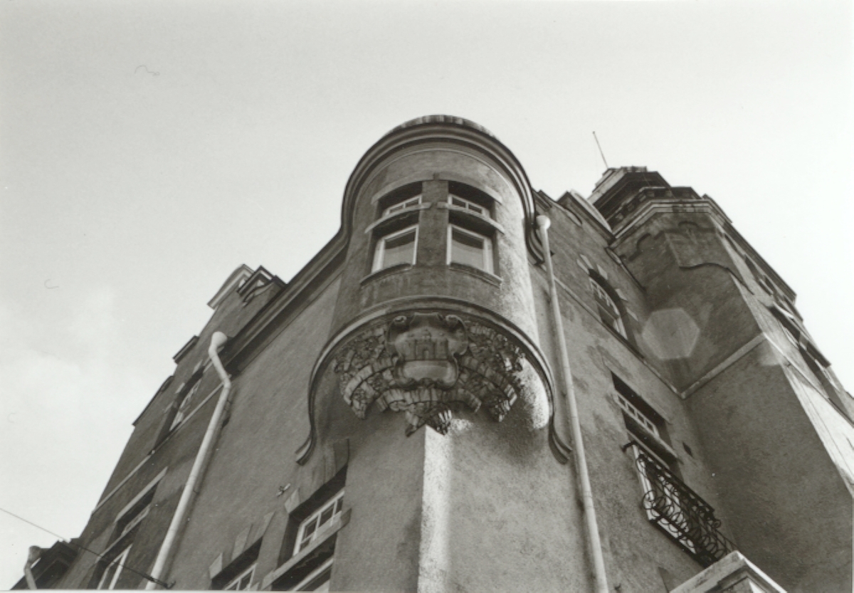 Hörnet mot Stortorget med Kalmar stads vapen i huggen sandsten.