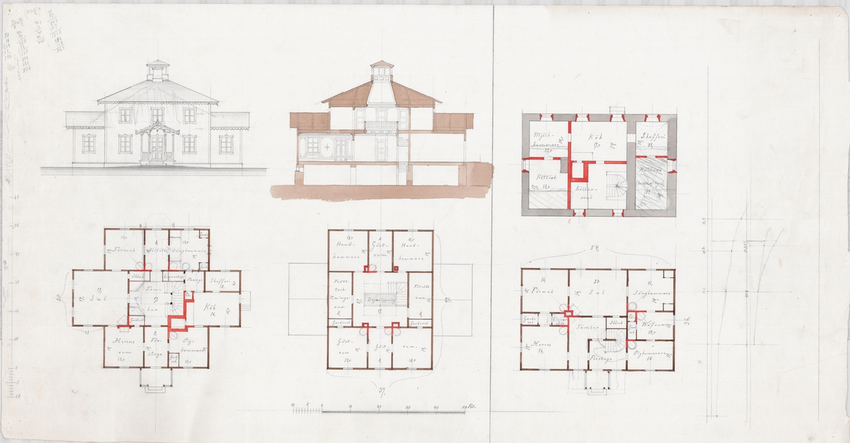 Titel: Kolorerad arkitektritning av Hugo Hammarskjöld. Projekt: Boningshus. Utan årtal. Hus med lanternin. Inga uppgifter om byggnaden kom att uppföras.