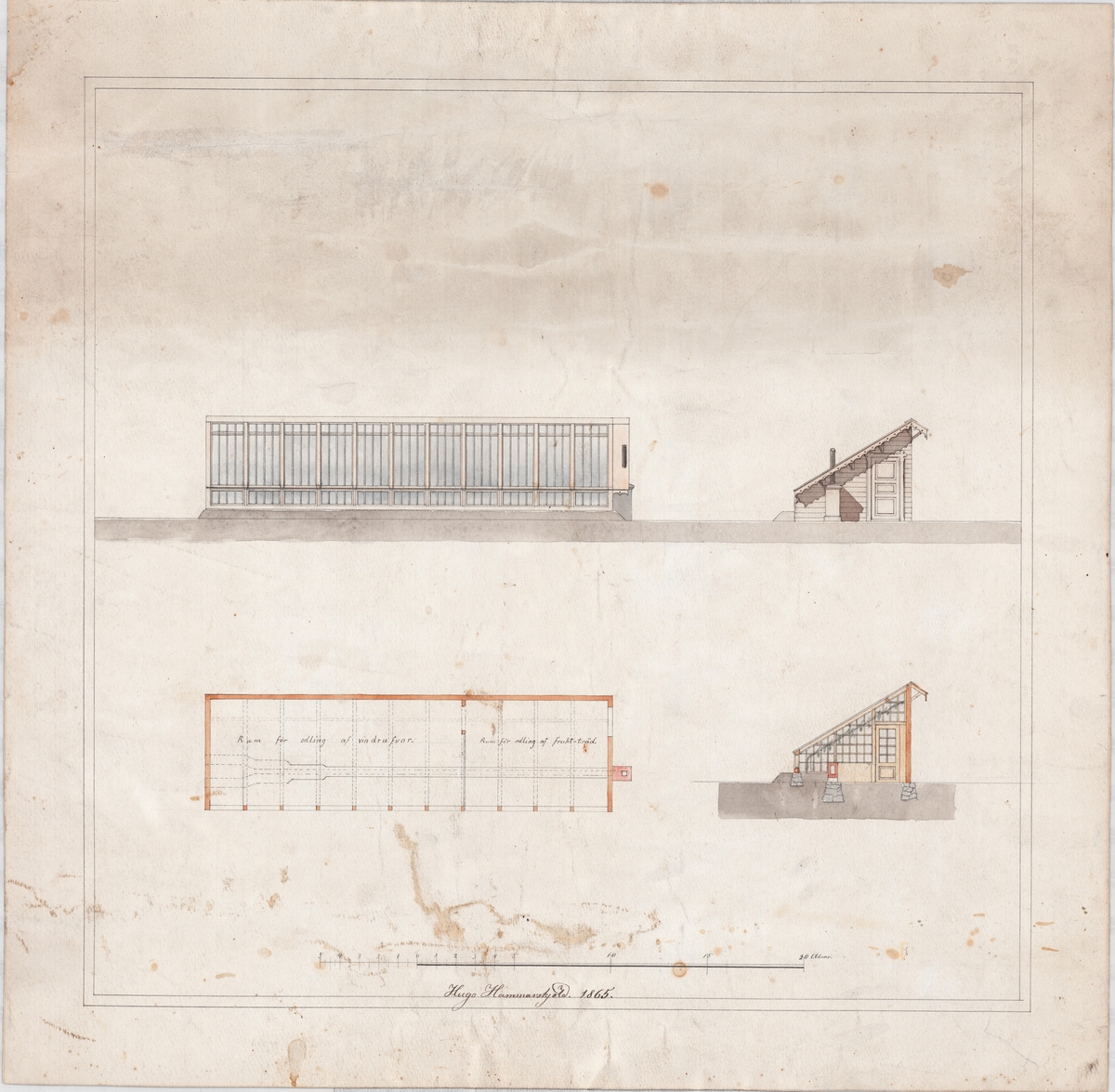 Kolorerad arkitektritning av Hugo Hammarskjöld. Växthus. Projekt under studietiden i Stockholm 1865: Byggnad med rum för odling av vindruvor och fruktträd.