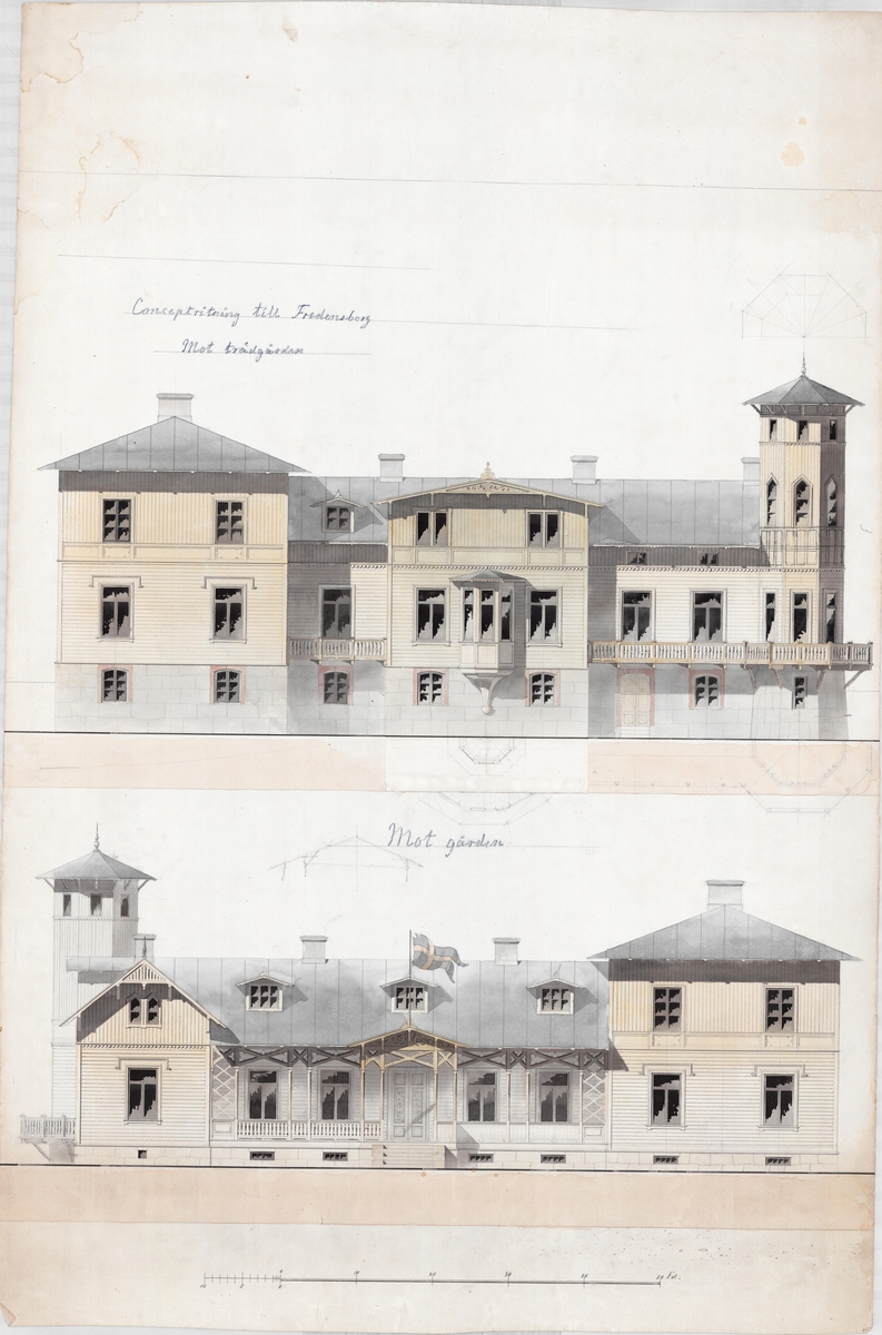 Kolorerad arkitektritning av Hugo Hammarskjöld. Projekt: Fredensborgs herrgård. Utan årtal.