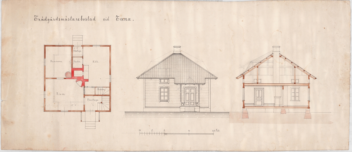 Kolorerad arkitektritning av Hugo Hammarskjöld. Projekt: Trädgårdsmästarebostad Tuna gård. År 1915.