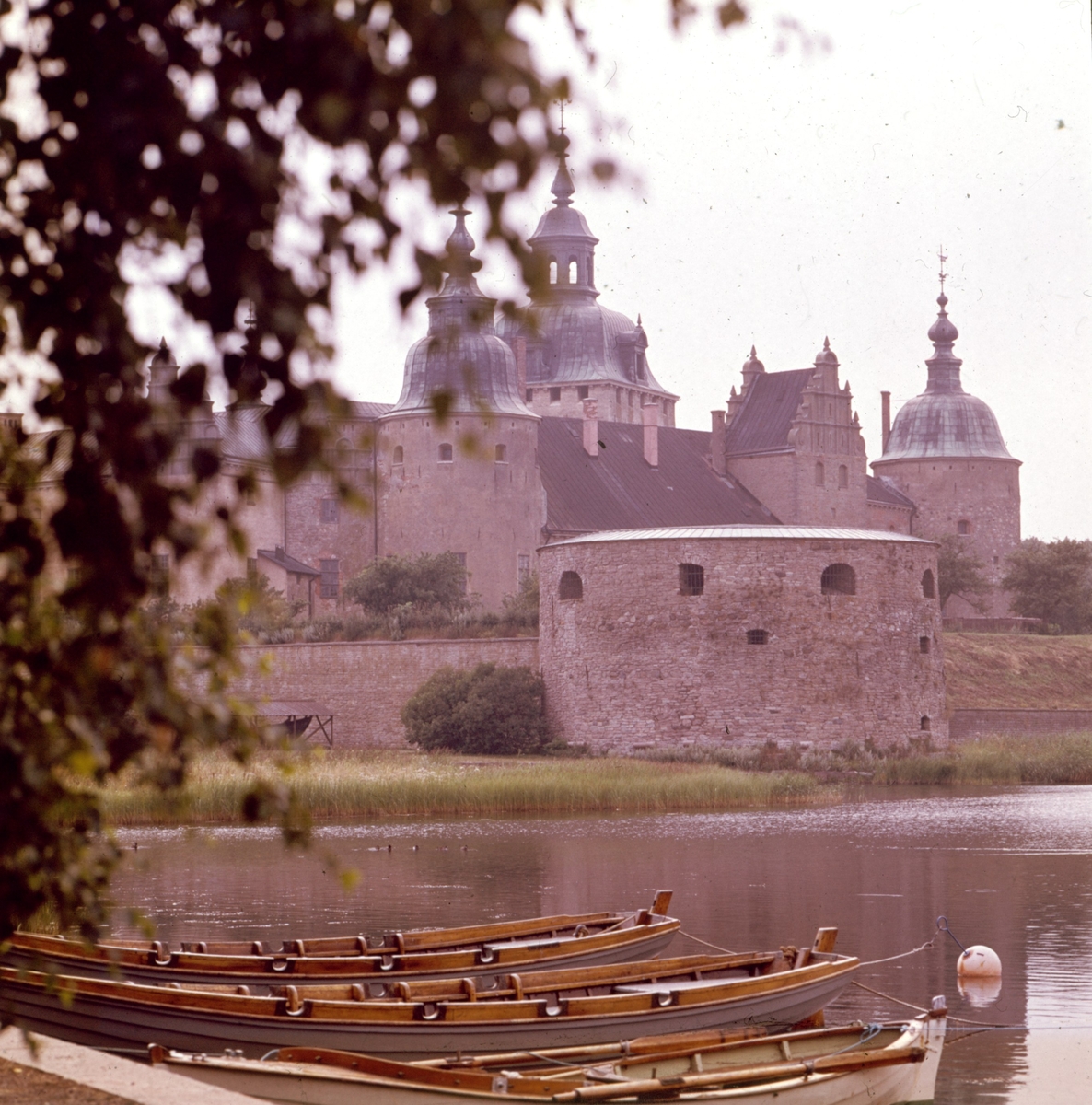 Utsikt mot Kalmar slott med en av postejerna. I förgrunden tre förtöjda fritidsbåtar i trä. Vid slottet kan skymtas ett fartygsskrov i trä under trätak. Bilden tagen från utsidan av Tjärhovsbågen med den enkla båtbryggan.