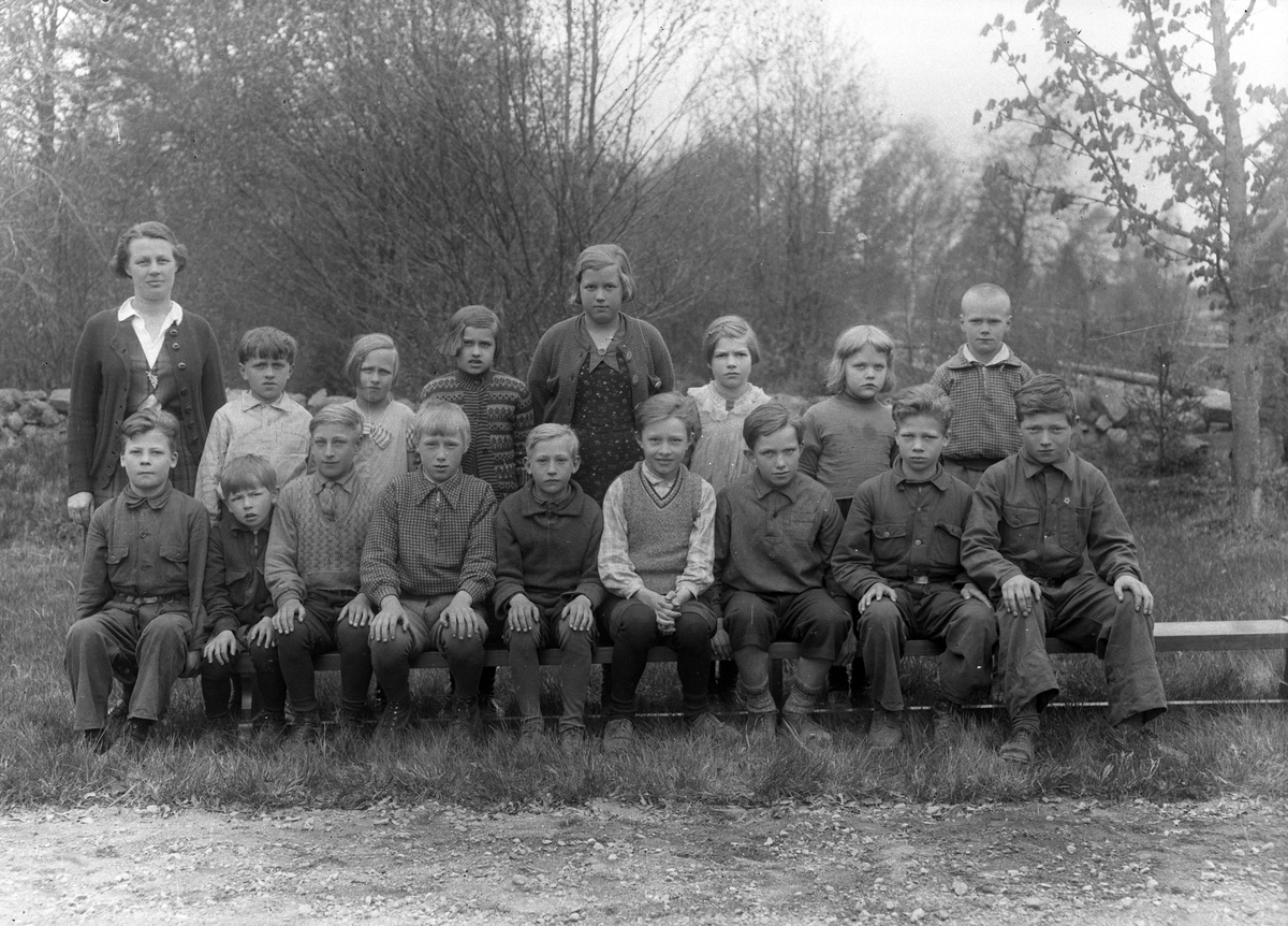 Foto av en skolklass med lärarinna, som samlats utomhus.