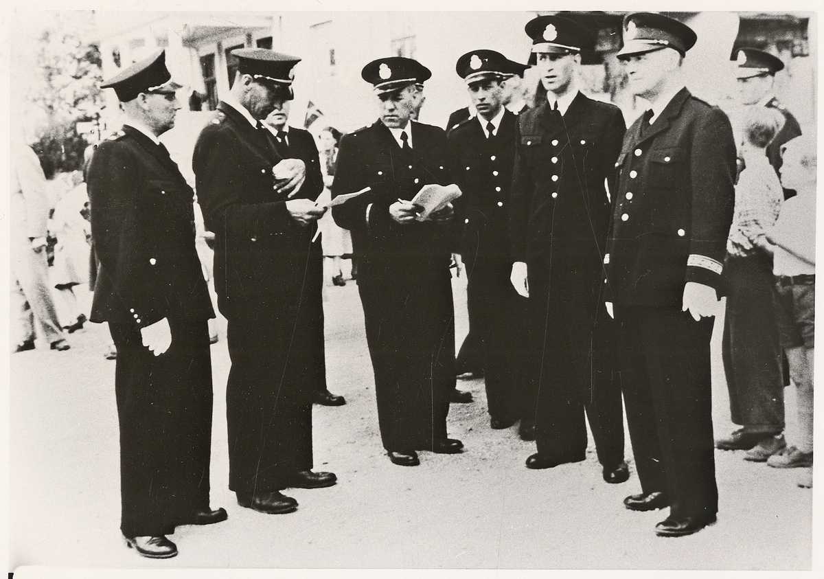 En grupp poliser vid kung Gustaf VI Adolfs besök i Åseda 1954.