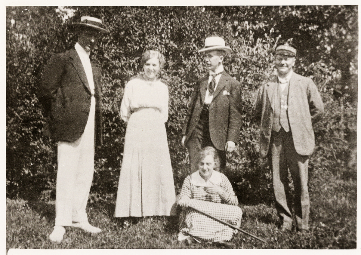 Kronolänsman Ernst Kjellerstedt t.h. med gäster i en trädgård, ca 1915.