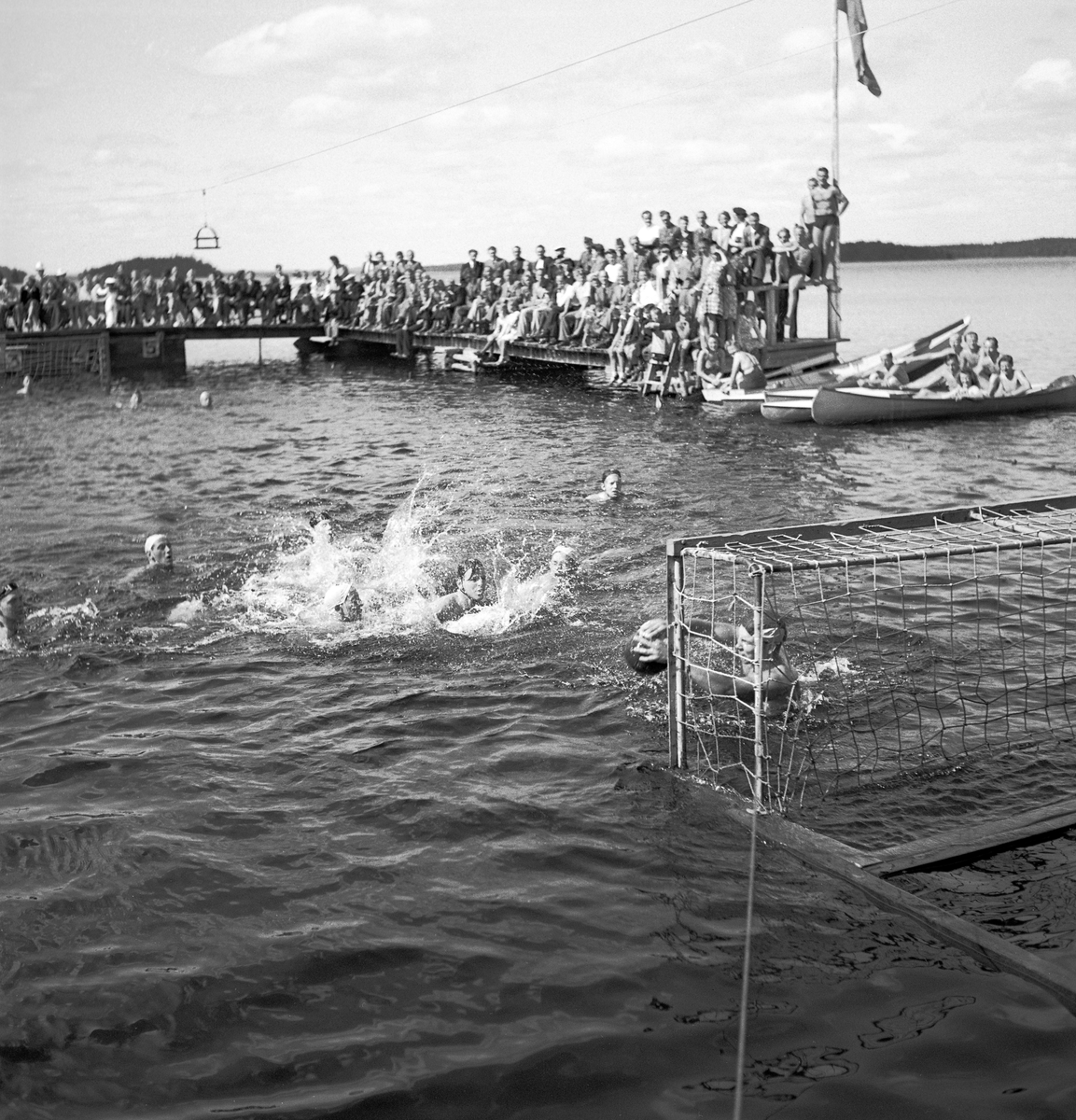 Titel: Evedal, 1943. Vattenpolomatch. I bakgrunden syns bl a en brygga med mycket publik.