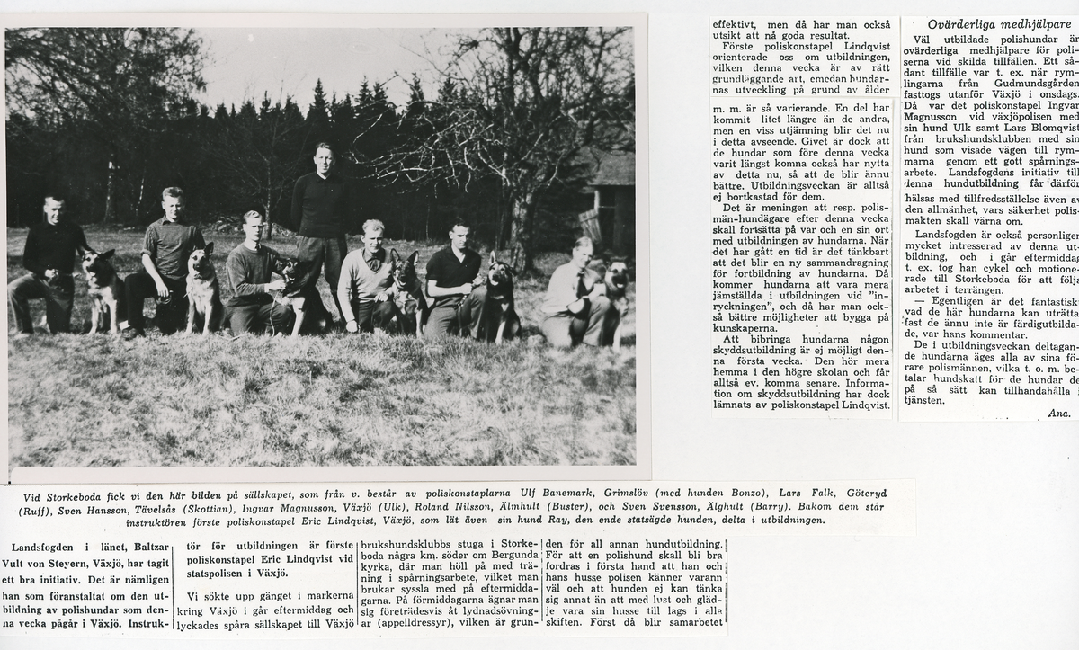 "Vid Storkeboda fick vi den här bilden på sällskapet som fr. v. består av poliskonstaplarna Ulf Banemark, Grimslöv (med hunden Bonzo), Lars Falk, Göteryd (Ruff), Sven Hansson, Tävelsås (Skottian), Ingvar Magnusson, Växjö (Ulk), Roland Nilsson, Älmhult (Buster) och Sven Svensson, Älghult (Barry).