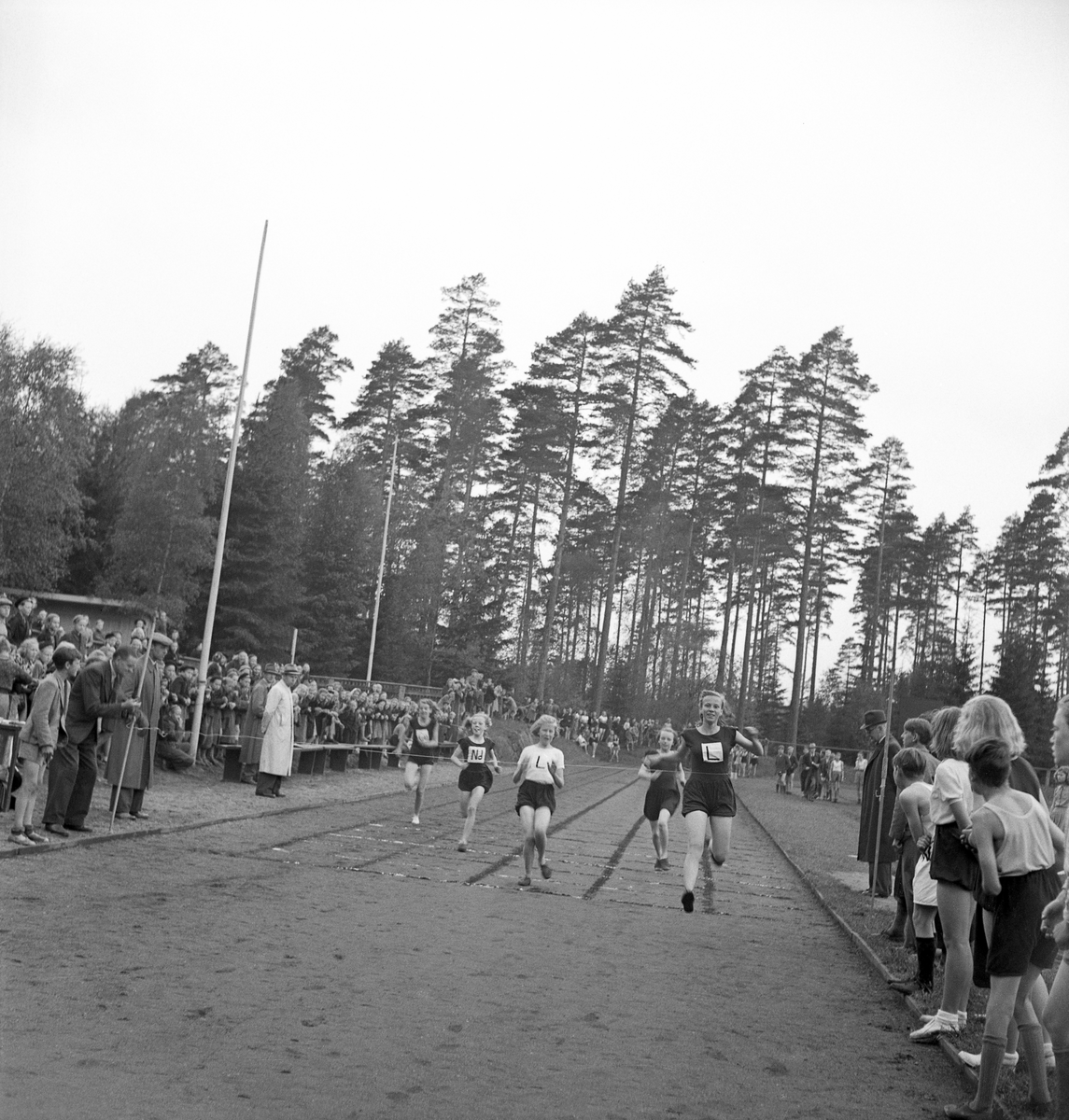 Titel: Folkskolans tävlingar, 1944. Målgång för ett sprinterlopp för flickor.