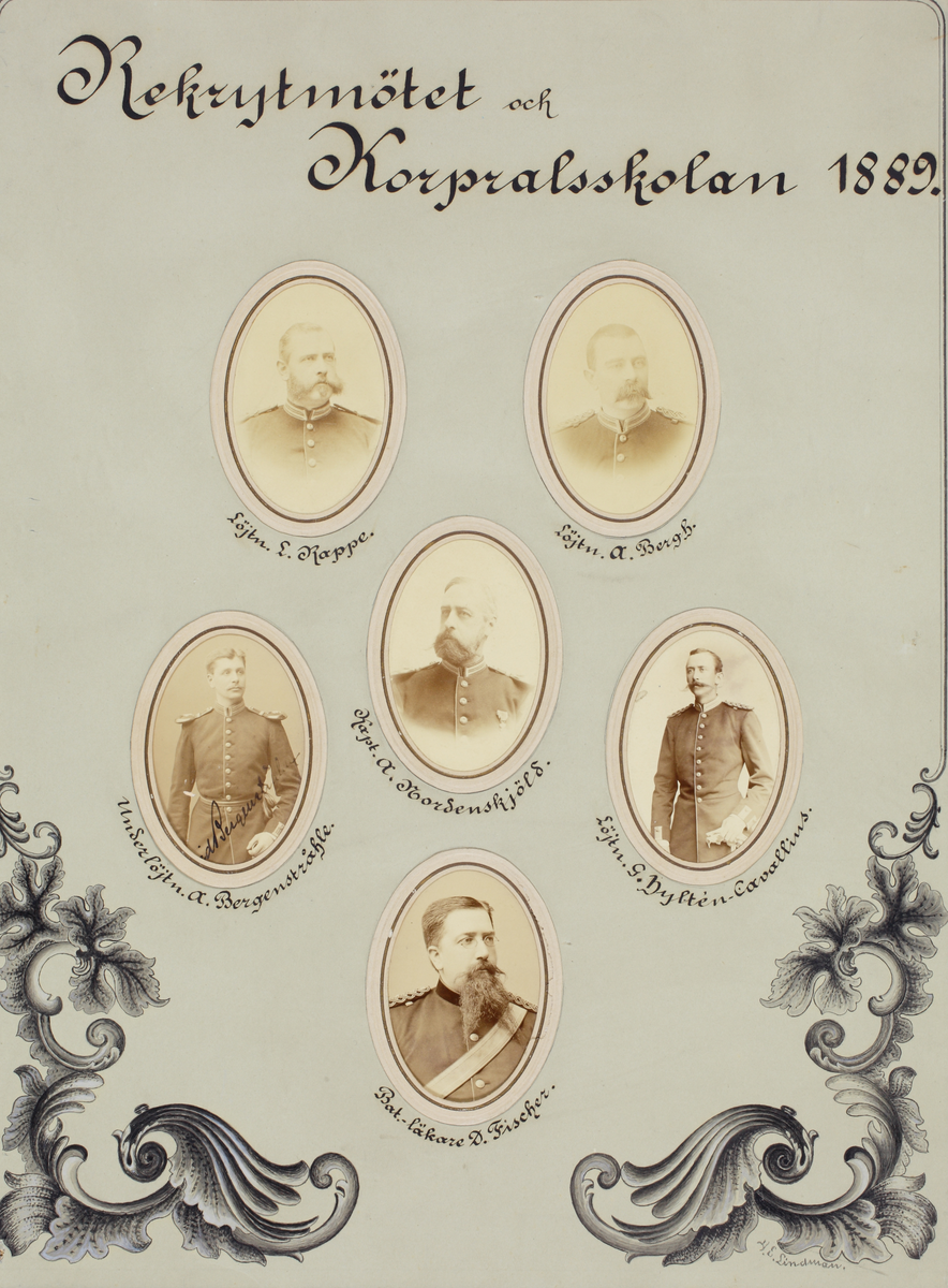 Mellersta raden fr.v.: underlöjtnant A. Bergenstråhle, kapten A. Nordenskjöld, löjtnant G. Hyltén-Cavallius.