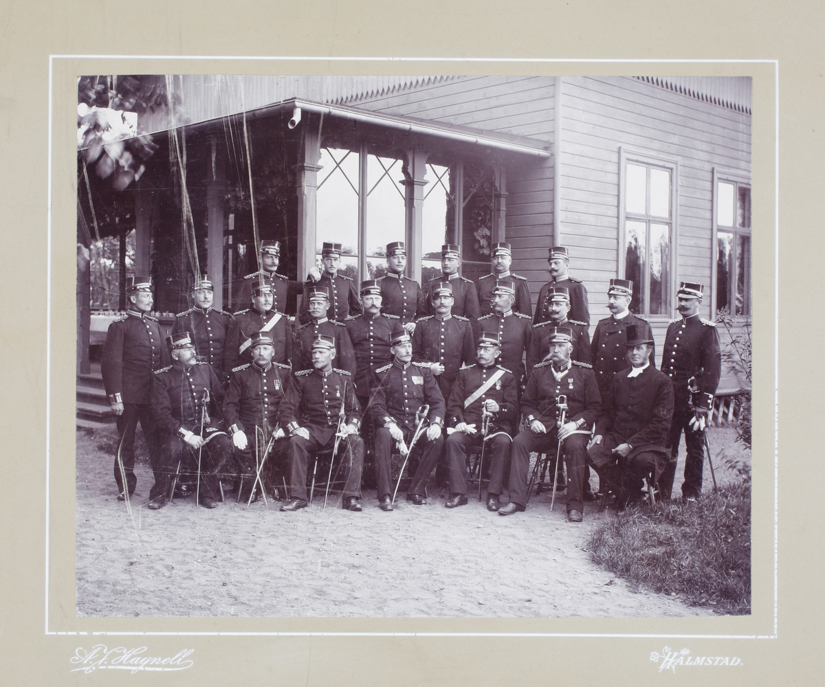 En grupp officerare (och regementspastorn) har samlats vid en officersmäss (?). 1890-tal.