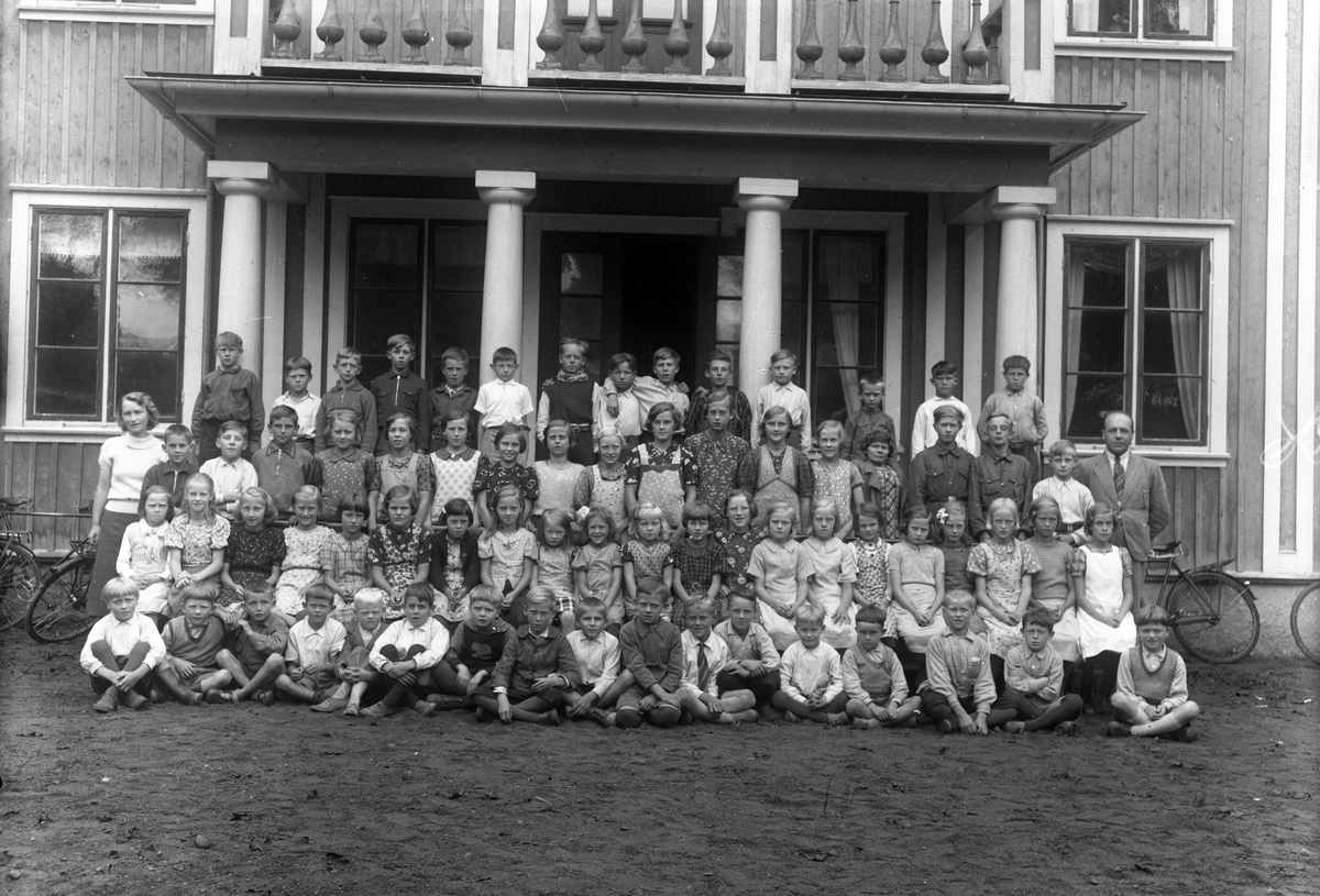 Foto av två skolklasser med två lärare, som samlats utanför skolan.