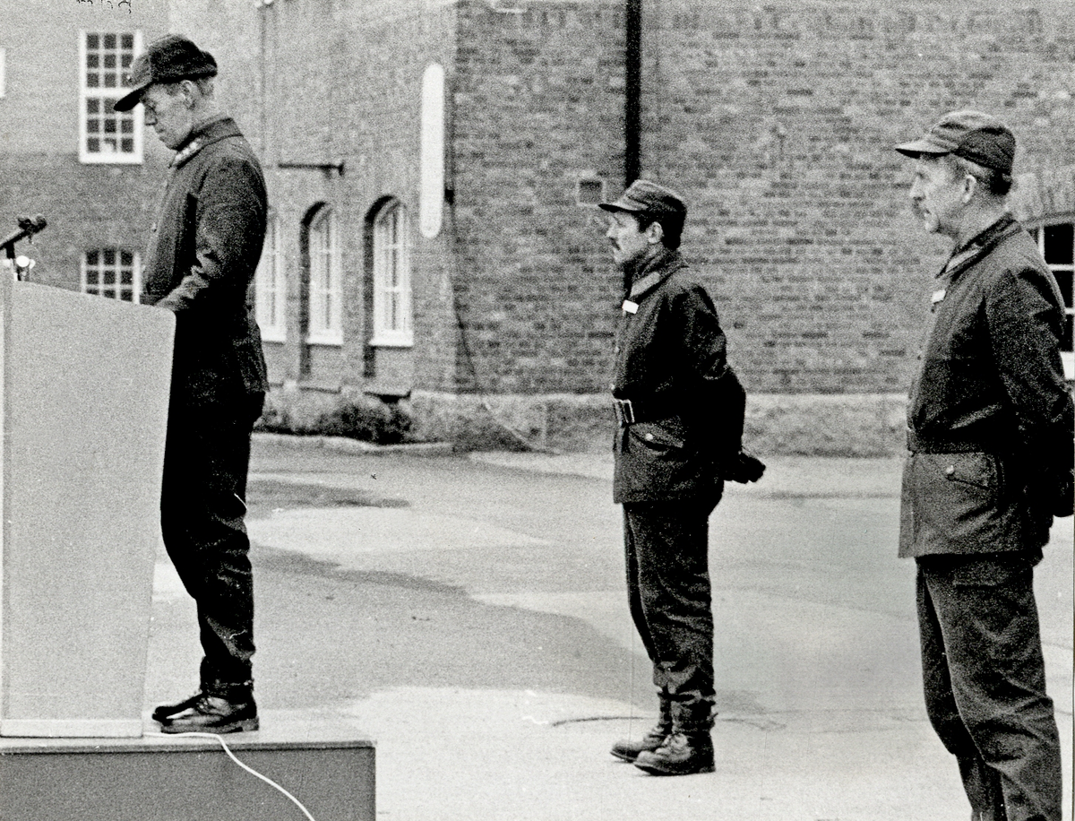 I talarstolen MB generallöjtnant Karl Erik Holm, bakom fr.v.: chefen utbildn. MiloS överstelöjtnant Wrangdahl och Ainsp MiloS överste1 Lennart Löfgren.