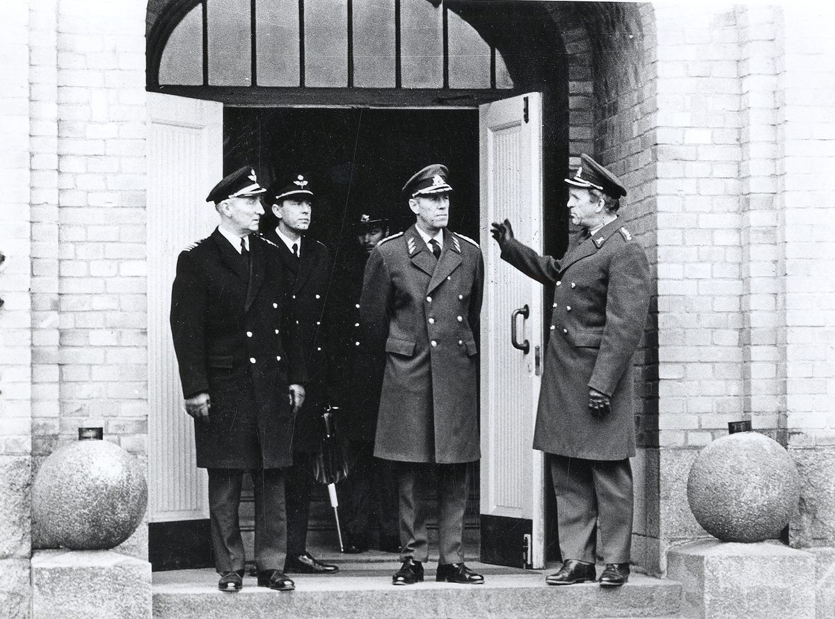 Nye MB, generallöjtnant Karl-Eric Holm (i mitten) inspekterar I11, åtföljd av bl a regementschefen I11, överste1 Lennart Löfgren (t.h.).
