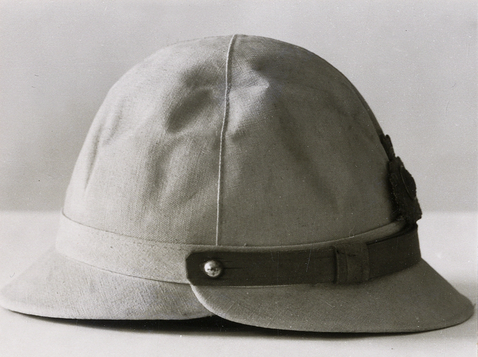 En s.k. solkask, även kallad "Stanleyhatt". Polisens sommarmössa från ca 1900-1925.