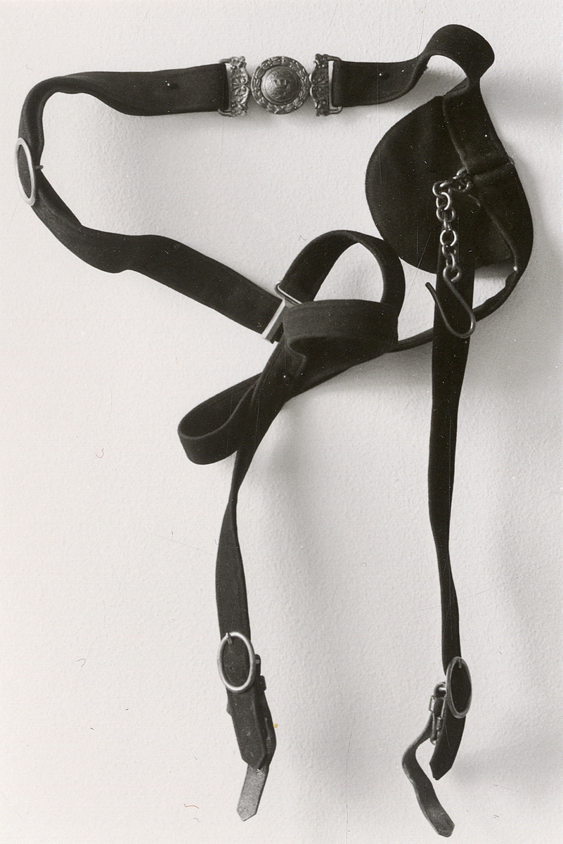 Gehäng av svart tyg med mässingsbeslag, med präglad dekor av Växjö gamla stadsvapen.