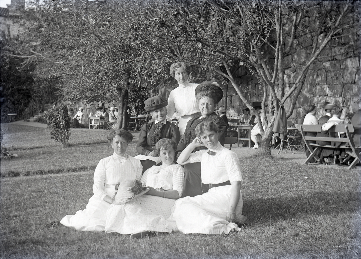 Några sommarklädda societetsdamer (i olika åldrar), har samlats i en liten park nära fästningen.