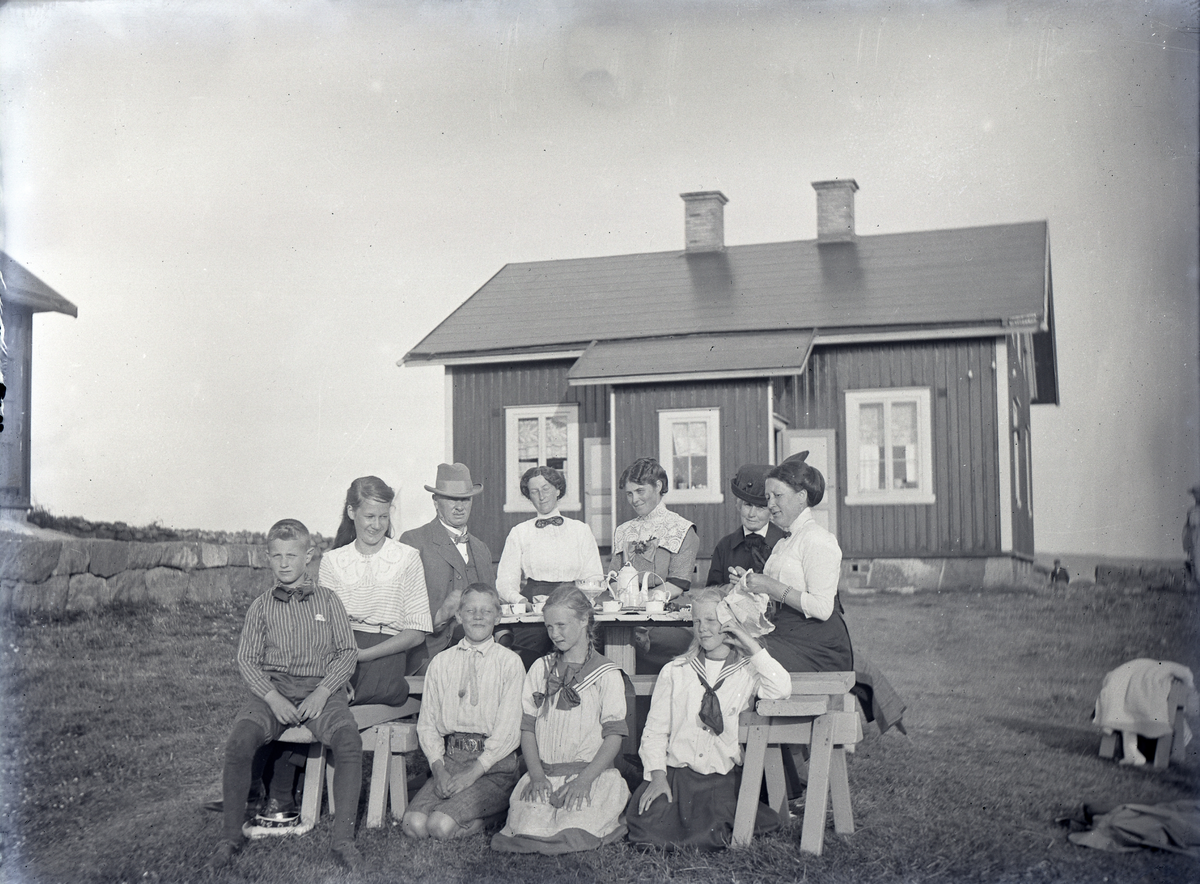 Några sommarklädda barn och vuxna har samlats kring ett enkelt kaffebord utomhus. I bakgrunden syns ett bostadshus, troligtvis hyrt som sommarställe.