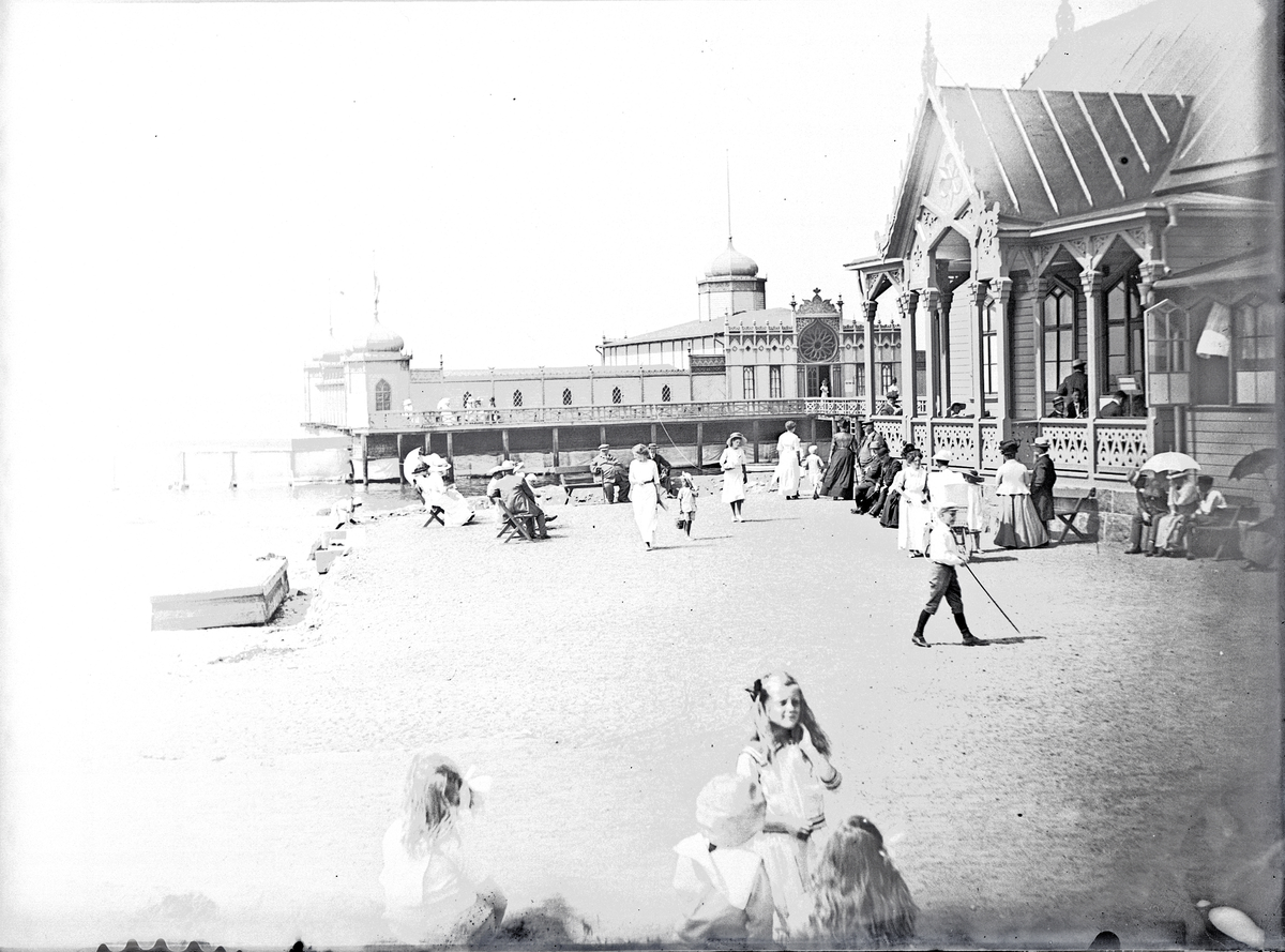 Badhuset m.m. i Varberg. Det syns en hel del människor på planen framför restaurangen.