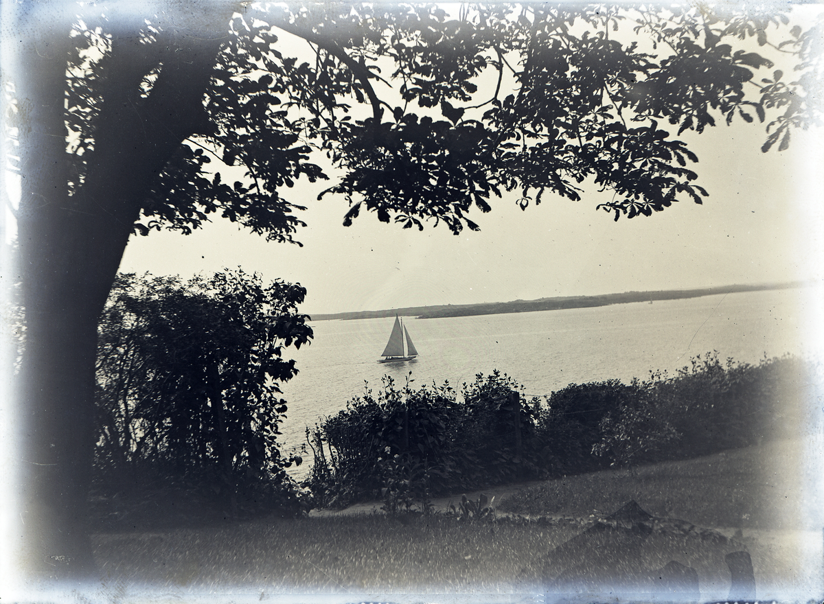 En havsfjärd med en segelbåt. Taget från en sommarvillas trädgård.