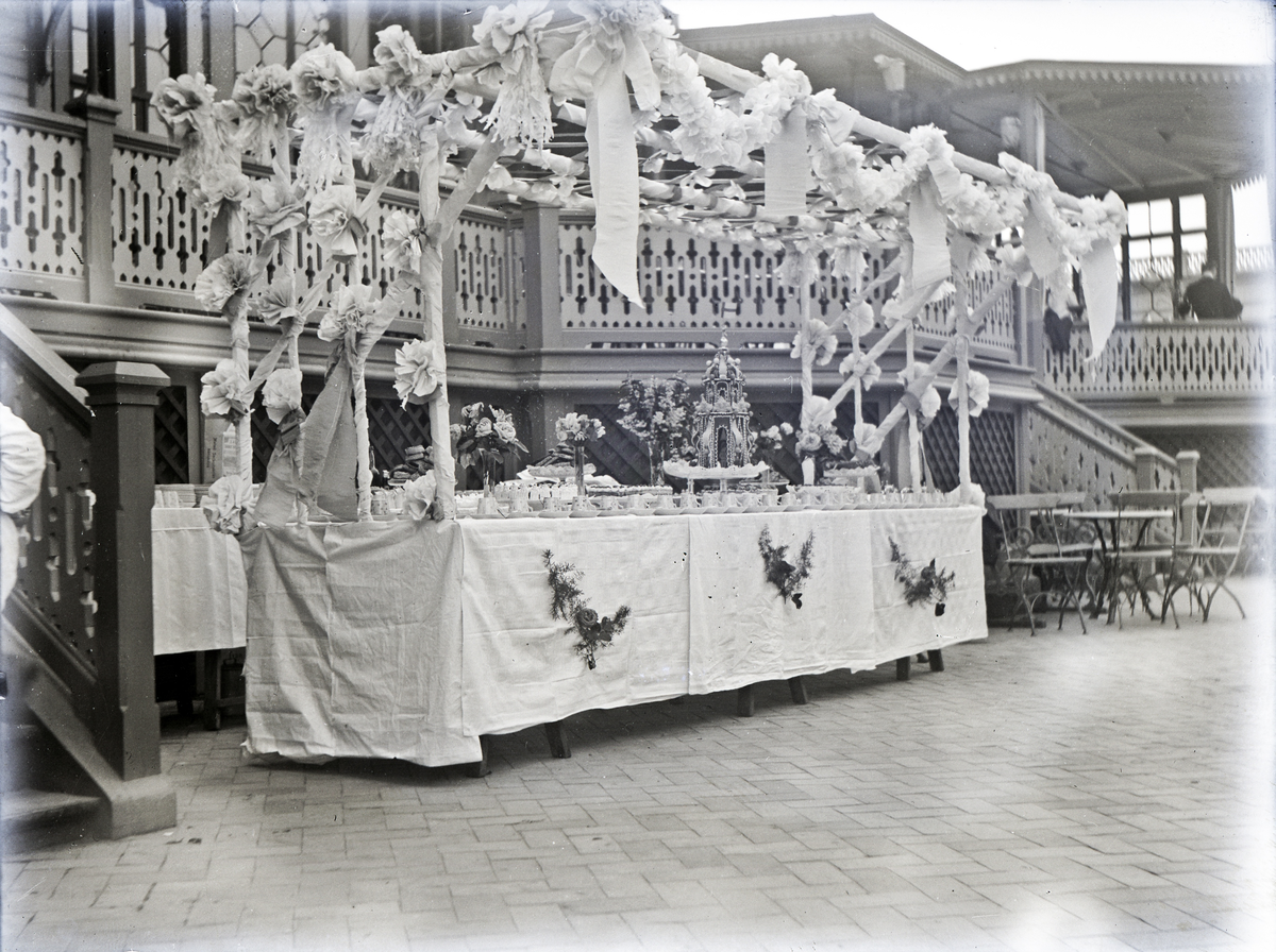 Ett uppdukat och garnerat buffébord med kaffekoppar i mängder, blomvaser och en stor krokan, utanför Societetshuset.