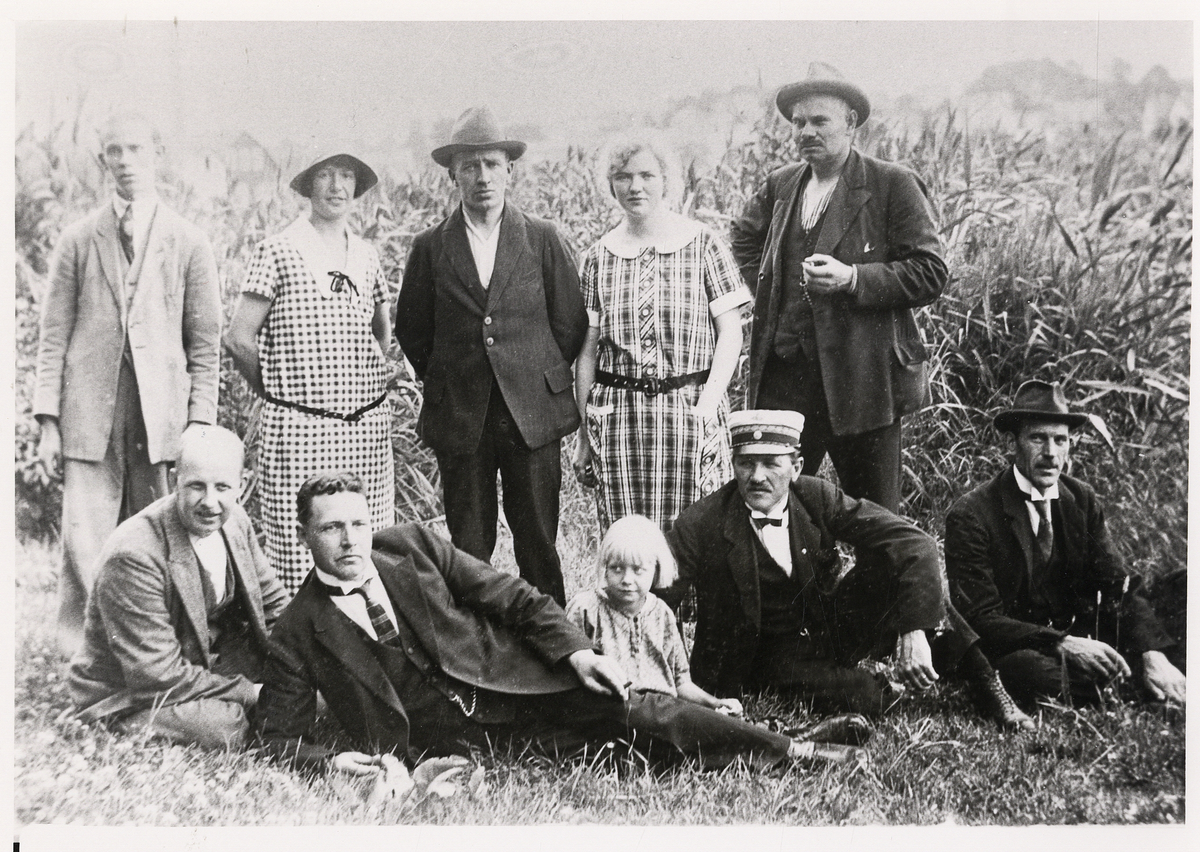 Poliskonstapel Per Ohlsson, Alvesta, (första raden, 4:e fr. v.), på utflykt med några medlemmar ur Alvesta Handelsförening, ca 1925.