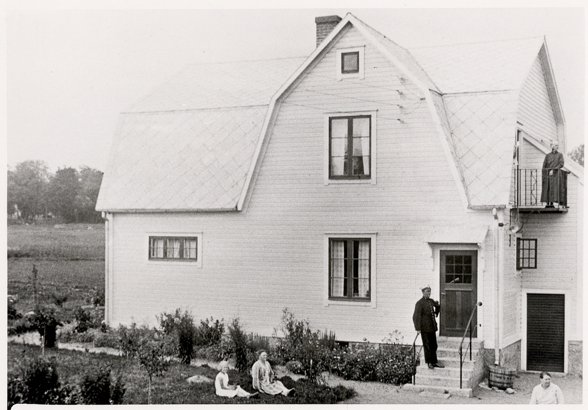 Poliskonstapel Per Ohlsson (och delar av familjen) vid det egna huset, Trädgårdsgatan (kv. Mården 4) i Alvesta, ca 1930.