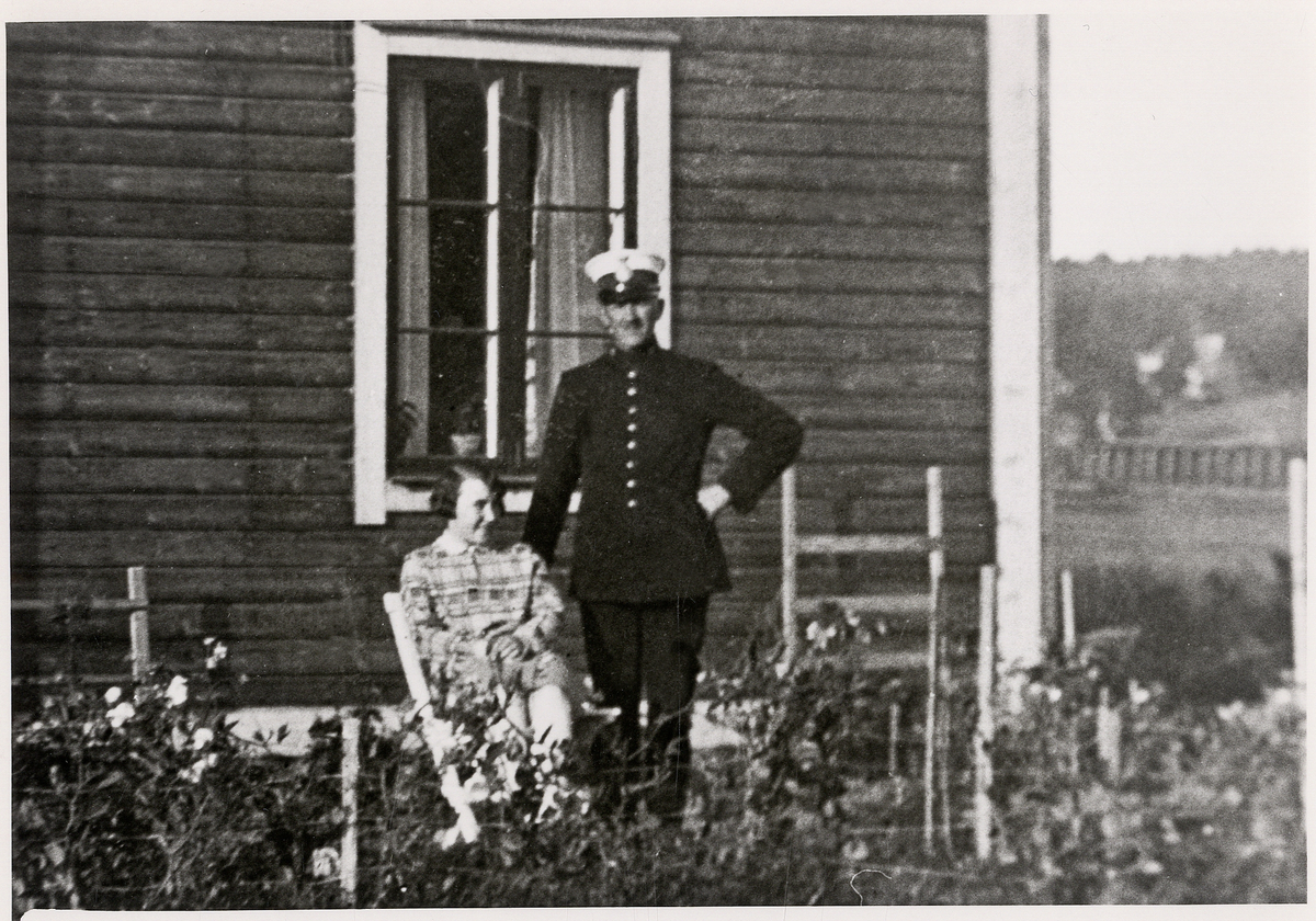 Poliskonstapel Per Ohlsson med hustru, i en trädgård någonstans i Alvesta ca 1930.